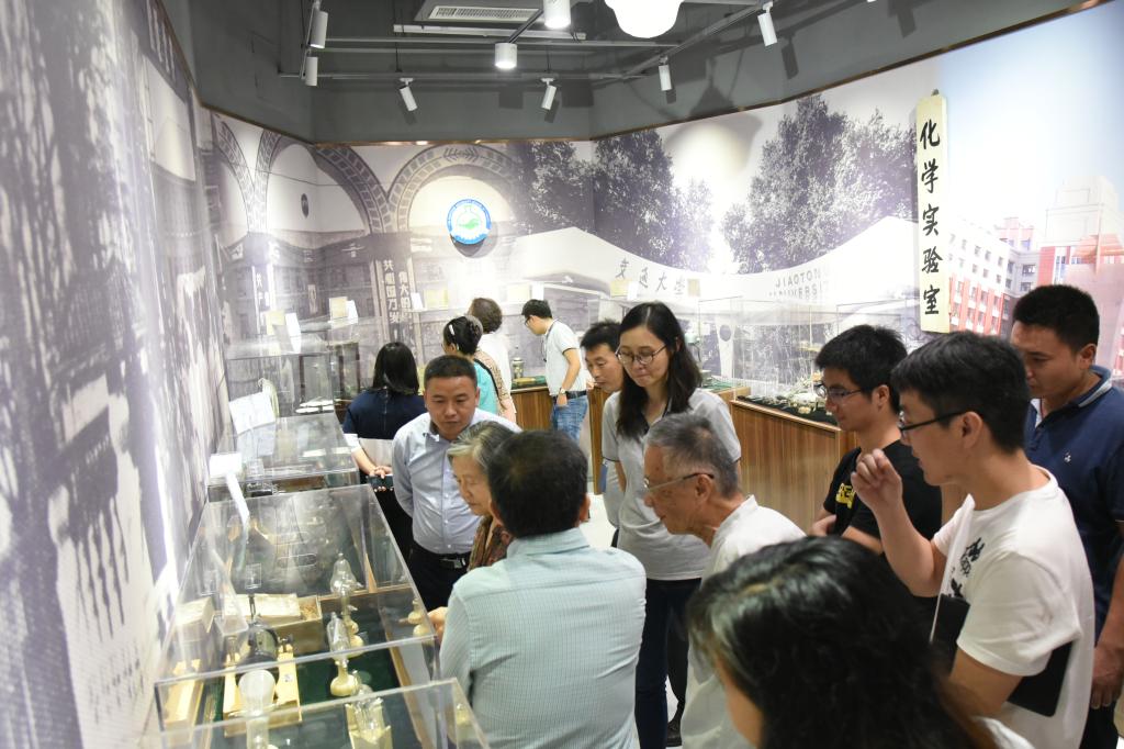 在交大化学发展陈列室里,退休老教授们看到了自己熟悉的化学实验室标牌和各种迁校早期的进口实验仪器和药品,都非常激动。作为实验室老物件的收集和整理人,郗英欣教授如数家珍,给大家讲解了每一件仪器设备的名称及由来,给大家上了一堂非常生动的思政课。