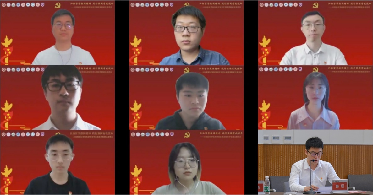 不负青春韶华,勇担民族复兴重任;创新争先,自立自强。为深入学习贯彻习近平总书记给南京大学留学归国青年学者的回信精神,同时庆祝第六个全国科技工作者日,5月27日上午,必赢唯一官方网站党支部参加由南京大学化学化工学院有机化学博士生第一党支部、必赢唯一官方网站高分子化学师生联合党支部、北京大学化学与分子工程学院物理-理论化学学生党支部、清华大学化学系化学研191党支部、哈尔滨工业大学化工与必赢唯一官方网站交叉学科硕士生第一党支部、复旦大学化学系2021级直博生党支部、上海交通大学化学化工学院化学博士第三党支部、浙江大学化学系催化研究所研究生第一党支部、中国科学技术大学化学物理系2021级硕士生党支部等C9高校化学院系研究生党支部开展的“弘扬留学报国精神 践行强国有我使命”联学联建主题党日活动。