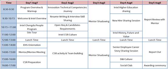 其间,英特尔将为每位同学委派资深员工作为导师,带领同学们全方位体验英特尔的工作氛围,促进学生理解未来工作所需的技能,提前做好职业发展规划。在活动的最后一天,每位学生需要就一周的所见所闻所得和建议做总结陈述分享。
