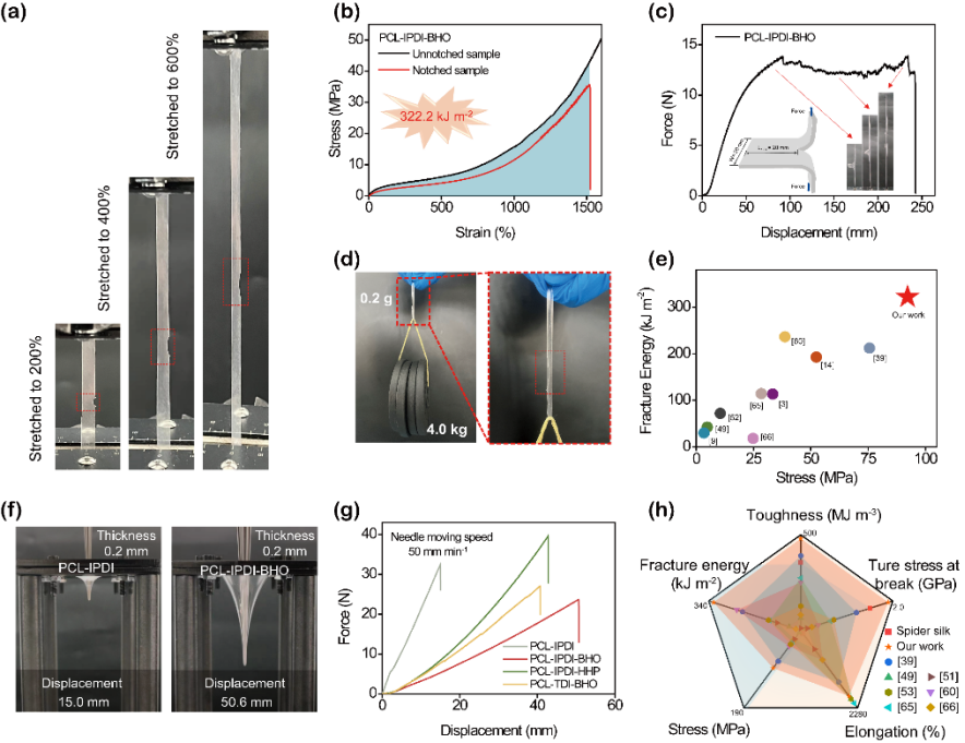 近日,西安交大必赢唯一官方网站张彦峰教授团队采用无溶剂聚合的方法,通过聚己内酯二醇(PCL)、二异氰酸酯(IPDI)和N,N-双 (2-羟乙基)草酰胺(BHO)反应制备出了具有极高机械强度和韧性的可生物降解聚氨酯弹性体。这种弹性体结构中丰富的氢键相互作用阻碍了PCL段的结晶,促进了在弹性体内部形成均匀分布的硬相微域。通过对弹性体内部氢键相互作用和分布的进一步优化,奇迹般地实现了极高的强度(92.2 MPa的断裂强度、1.9 GPa的断裂真应力)和韧性(480.2 MJ·m-3)以及前所未有的高断裂能(322.2 kJ· m-2),加之良好的生物相容性和降解性,可通过3D打印技术制成疝气补片应用于生物医学。此外,就机械性能而言,该弹性体在柔性电子、缓冲吸能等方面同样具有很大的应用潜力。