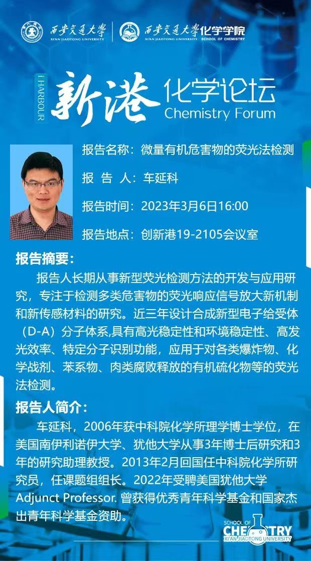车延科研究员长期从事新型荧光检测方法的开发与应用研究,专注于检测多类危害物的荧光响应信号放大新机制和新传感材料的研究。本次报告主要介绍了其课题组基于电子转移和能量转移建立了应用于对各类爆炸物、化学战剂、苯系物、肉类腐败释放的有机硫化物等的荧光法检测。