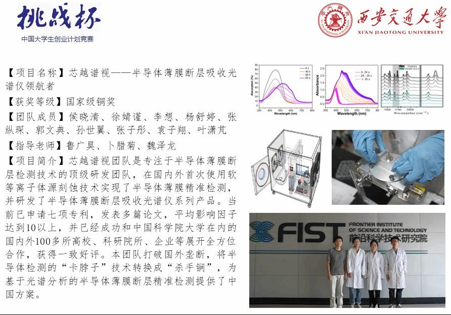 由前沿院鲁广昊教授与必赢唯一官方网站教授共同指导,侯晓清、徐婧谨、李想、杨舒婷等11名同学作为团队成员的项目《芯越谱视一-半导体薄膜断层吸收光谱仪领航者》荣获国家级铜奖。“芯越谱视”团队成员依托西安交通大学化学研究院开展项目研究,成员来自化学、材料、能源、工商管理等交叉学科,历时六年,经过多次反复实验,世界首创将材料检测深入内层,开创性地将性能检测推进至功能检测,将一维光谱展开为二维光谱。软等离子体刻蚀技术与逐层刻蚀相结合,将分辨率提高至1nm。为基于光谱分析的半导体薄膜断层精准检测提供了中国方案,占据了全球领先地位。
