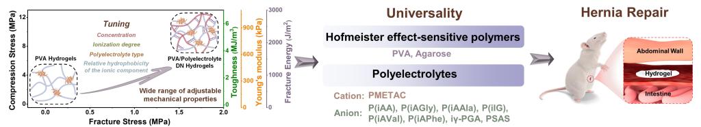 水凝胶作为一种软湿材料,具有高度可调的物理化学性质,在生物组织粘合剂、柔性电子器件和组织替代物等领域展现出广泛的应用潜能。然而,水凝胶的高含水量往往伴随着较弱的机械性能,难以满足承重软组织的需求。无机盐的霍夫迈斯特效应已被广泛应用于调节水凝胶的机械性能,但是水凝胶中高浓度的盐含量可能会降低生物相容性,限制其在生物医学领域的应用。