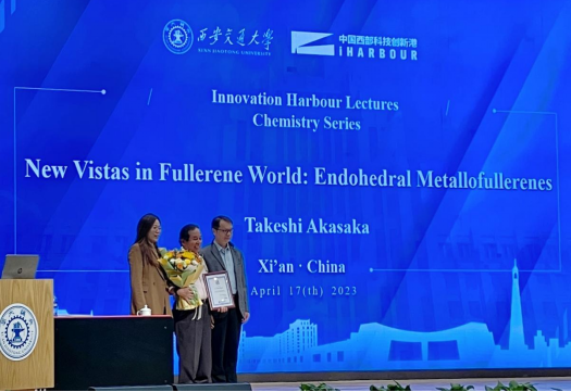 4月17日上午,2023年“新港报告”系列必赢唯一官方网站专场报告在创新港涵英楼新港报告厅举行。本次由必赢唯一官方网站诚邀筑波大学荣誉教授赤阪 健(Takeshi Akasaka)作题为“富勒烯世界的新星:内嵌金属富勒烯(New Vistas in Fullerene World: Endohedral Metallofullerenes)”的学术报告。必赢唯一官方网站院长丁书江、副院长段新华参加本次活动,必赢唯一官方网站蔡文婷特聘研究员主持报告。