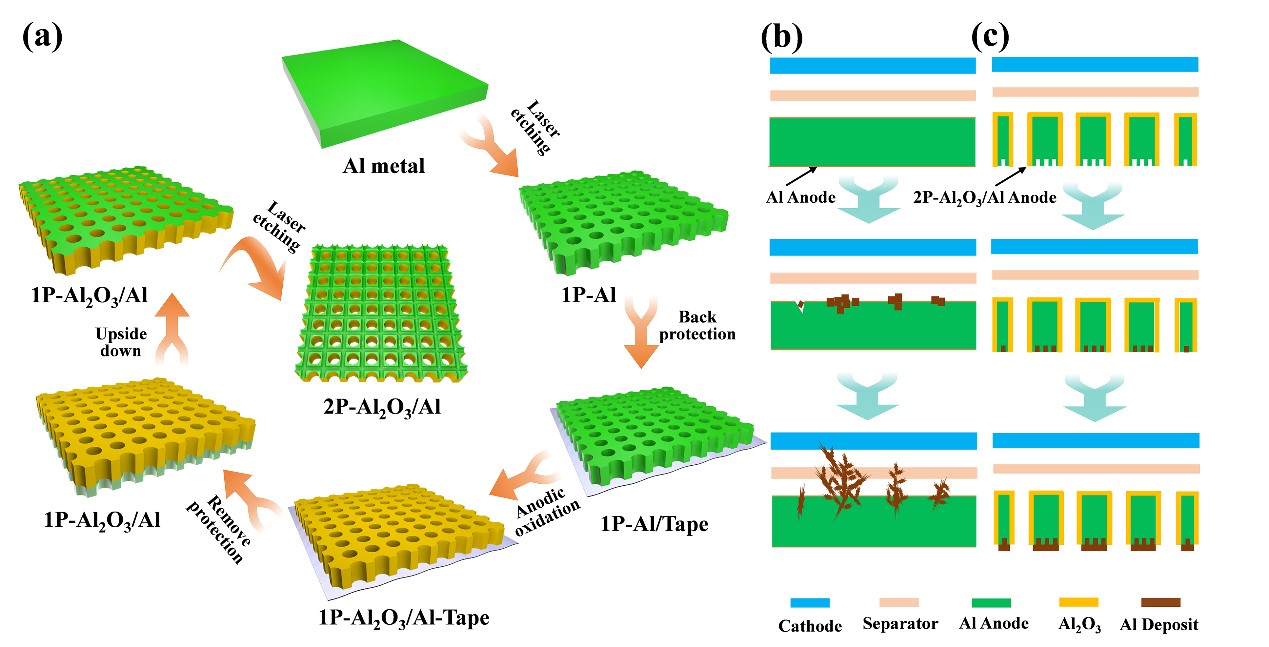 近年来,全球能源系统已经由化石能源向可再生能源转化,而能源存储是可再生能源利用的关键。能源存储有多种方法来实现,而以电化学方式储存能量的电池是效率最高且能够大规模应用的一种方法。铝电池(AIB)因其低成本、高理论容量(理论体积比容量和质量比容量分别为8048 mAh·cm-32981 mAh·g-1)和高安全性(遇水和空气时不燃烧)而受到广泛关注。然而,由于金属阳极电池在充电过程中不受控制的表面形态、化学反应和流体动力学过程,枝晶的生长不可避免。最近的研究表明,3D金属阳极可以增加电极和电解质之间的有效接触面积,降低电极的局部电流密度,从而防止电极表面的腐蚀和枝晶生长。但由于较高的电场强度和较短的离子扩散路径,金属颗粒仍然倾向于优先沉积在电极的顶部区域。对于大面容量的铝电池系统,不可避免地会增加单位面积铝的沉积量。大量的铝沉积物会在正负电极之间架起桥梁,加剧枝晶生长,这将严重损害电池的长期稳定性和安全性。