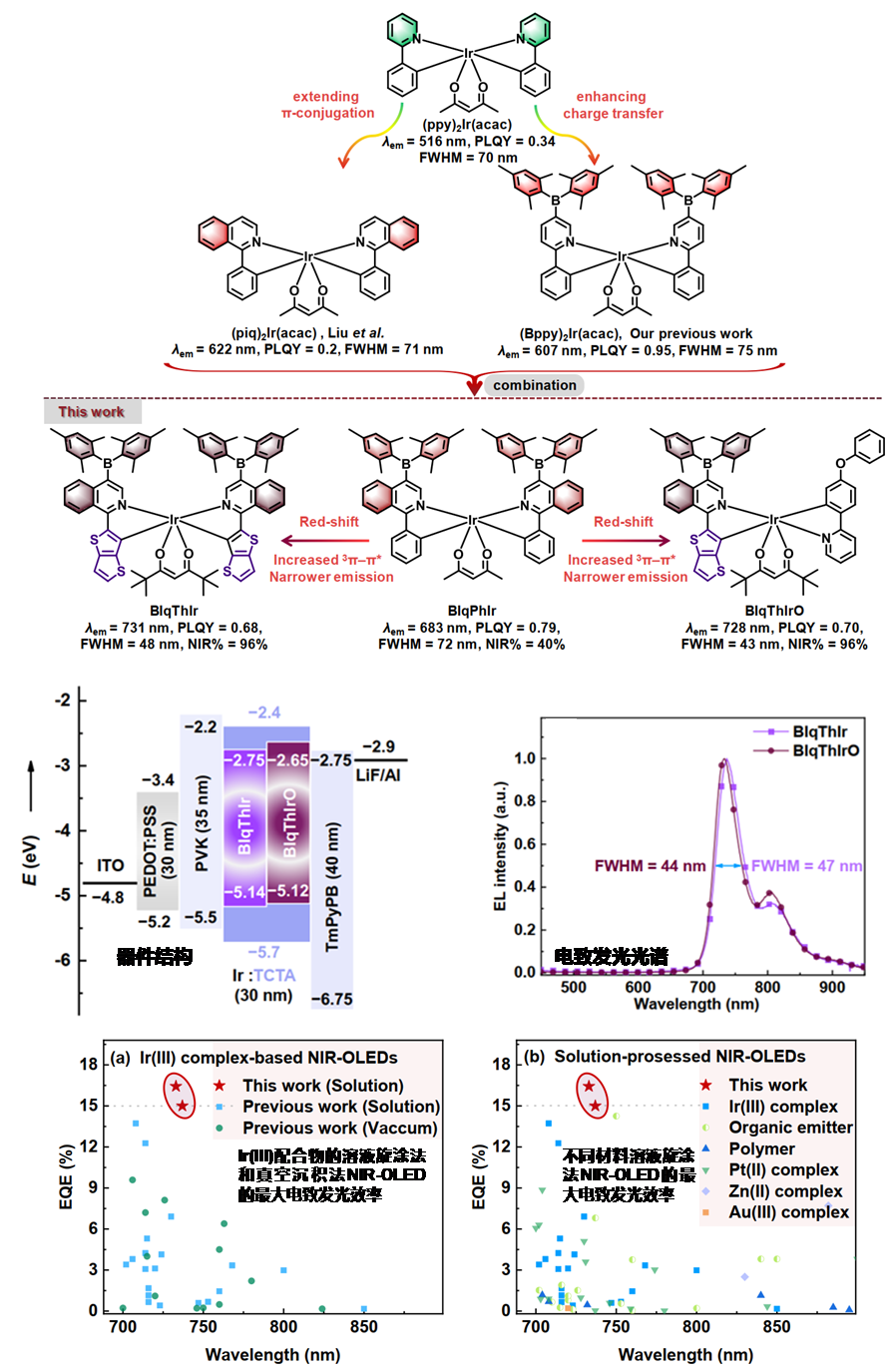 针对这一问题,必赢唯一官方网站杨晓龙、孙源慧、周桂江等人与五邑大学陈钊合作报道了电致发光效率达到16.43%的纯近红外发光NIR-OLED。作者通过优化Ir(III)配合物的分子结构设计降低金属中心到配体电荷转移跃迁,提高三线态激发态中的基于配体的ππ跃迁成分,成功地将发光光谱半峰宽降低至43 nm,获得了最大发射峰位于730 nm附近的高效率纯近红外发光材料。作者采用溶液旋涂法制备了相应的电致发光器件,获得了与对应材料光致发光光谱近乎一致的纯近红外电致发光光谱,且最高电致发光效率分别高达15.00%16.43%,显著超过了已报道的基于近红外Ir(III)配合物的NIR-OLED最高电致发光效率,也显著超过了采用溶液旋涂法制备的基于不同有机近红外发光材料的NIR-OLED最高电致发光效率。