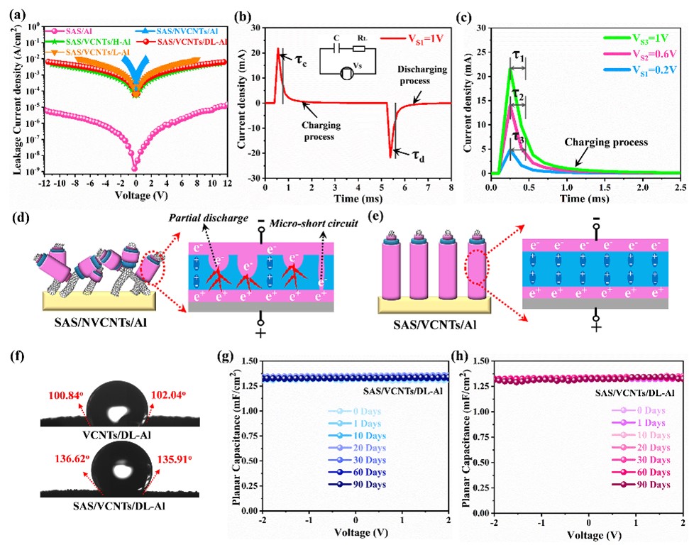 2. (a)电容器的漏电流密度与电压关系图;(b)电容器的充放电曲线;(c)电容器不同电压电源下的充电过程;(d,e)电容器的充电原理图;(f) 功能材料与水的润湿性;(g,h)为电容器在大气和水环境中的C-V特性稳定性。