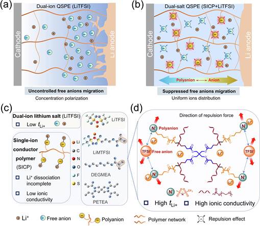 近日,必赢唯一官方网站丁书江教授和郗凯教授团队制备了含有单离子导体聚合物(SICP)锂盐和传统双离子锂盐(LiTFSI)的双盐体系聚合物电解质SF@d-QSPE。其中SICP可以提供聚阴离子,通过排斥作用降低自由阴离子(TFSI-)的移动速率,提高LTN0.75;同时传统双离子锂盐解离出足够的锂离子,确保了令人满意的有效锂离子电导率(σLi+0.87 mS cm1)。该双盐体系弥补了SICP锂盐σ低和传统双离子锂盐LTN低的不足,促进电解质中离子均匀分布,有效的缓解浓差极化。组装的Li||Li对称电池可以进行稳定的锂沉积/剥离,组装的Li||LiFePO4电池可以稳定循环2000圈。此外,软包电池在弯曲、刺穿和剪切状态下能点亮LED灯,展现出较好的柔性和界面接触稳定性。该工作为构筑高有效锂离子电导率和低浓差极化的聚合物锂金属电池提供新思路。