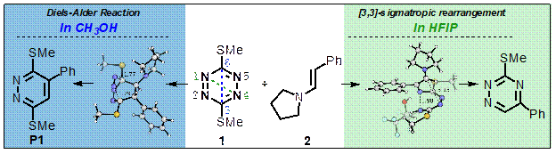 在有机化学中,含缺电子杂环偶氮二烯的反电子需求Diels−Alder(iEDDA)反应是合成多官能化杂环的一种有效方法。该反应目前已被广泛应用于生物正交偶联、天然产物全合成、金属有机框架修饰、碳纳米管功能化以及微阵列的构建等方面。这些反应通常在甲醇等溶剂中沿碳碳轴,通过Diels-Alder环加成(C3/C6环加成)的历程进行,生成一系列二嗪化合物。令人惊讶的是当以六氟异丙醇为溶液时,则发生反常的N1/N4环加成得到1,2,4-三嗪产物。迄今为止,六氟异丙醇对这类反应的选择性和路径的影响尚缺乏系统深入的理论研究。