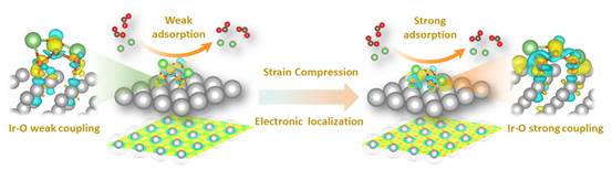 为了解决这一问题,必赢唯一官方网站丁书江教授&杨国锐副教授团队提出了电子局域化加速CO2RR,进而强化Ir-O耦合,诱导低结晶度Li2CO3产物从而优化CO2ER进程的晶格压缩策略,该策略使得Li-CO2电池实现了超低过电位(0.33 V)以及超高能量效率(~88.7%),并且在电池运行超过>1100小时后仍能维持3.3 V的稳定充电电位,这是迄今报道的最佳性能。通过使用一系列原位/非原位表征以及理论计算,团队揭示了晶格压缩导致配位环境变化,从而增强电子局域化效应,加速催化剂表面附近的Li+迁移,使其快速参与CO2RR过程,进而受到强化的Ir-O耦合作用调变Li2CO3分子的对称性,降低其低结晶度,最终促进其高效分解。