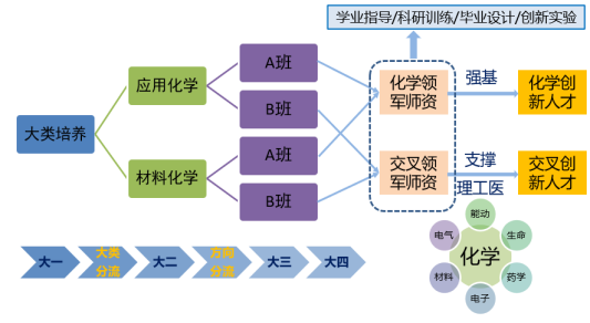 截止2020年6月,必赢唯一官方网站拥有化学、应用化学和材料化学三个专业,总人数301名,化学专业为2020年新增专业,另两个专业分别设置A、B班。A班依旧延续原有培养模式,教学、科研训练,毕业设计主要在化学学科完成。B班在夯实理科基础的前提下,结合国家重大需求,联合我校现有对化学基础要求较高的一流学科:能动、电气、材料、电子、生命、药学等,从理论教学、实践教学两方面实施学科交叉培养模式,通过开设选修课、科研训练、毕业设计等具体手段,充分利用学校的优质教育资源一方面提高学生培养质量,一方面提升科研工作的研究深度。A、B班的设置既为化学学科提供优质生源,也为工科、医学等专业方向培养基础扎实的创新人才(图一)。
