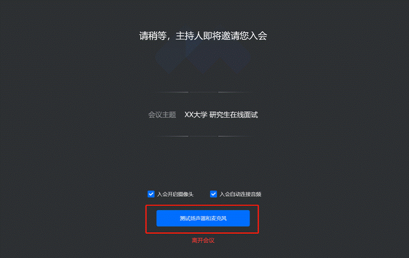 考生加入会议后进入等候区,为保证接入效果,可点击“扬声器和麦克风”进行语音设备测试,检测完音频效果后,等待监考老师批准加入面试会议。