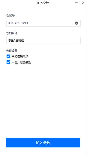 登录后进入等待室,主机位命名“姓名+考生编号后5位+主机位”,辅助机位命名为“姓名+考生编号后5位+辅机位”,加入会议后电脑端连接语音和视频,如果语音和视频不正常在屏幕左下角连接和启用视频,辅助机位关闭音频并保持摄像头开启状态。