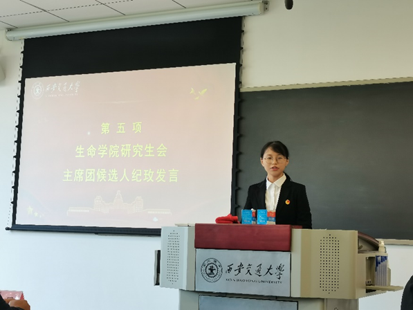 生命科学与技术学院研究生会主席团候选人纪玫指出长期以来两院学生会互相学习,互相支持,互相勉励,构建了和谐的合作关系,结下了深刻友谊。希望在未来与我院研究生会在工作中相互交流,在交流中相互学习,在学习中继续加深两院学生的友谊,优势互补,共同谱写两院研究生会工作的新篇章。