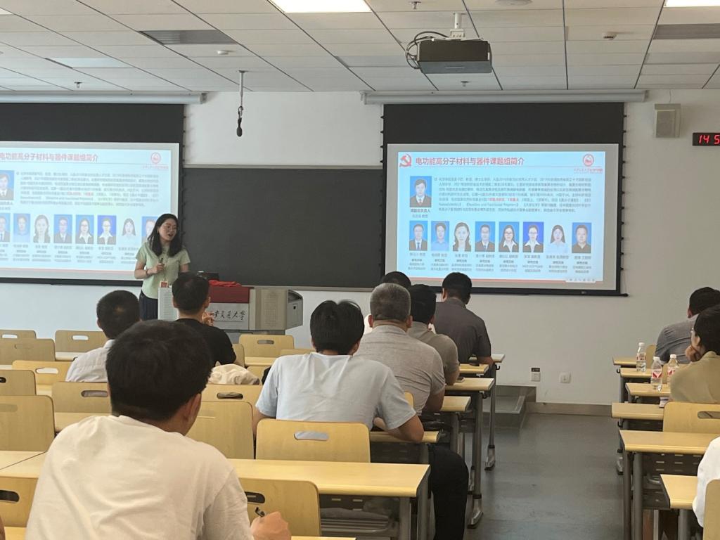 活动第二项,高分子化学师生联合党支部介绍与传感研究进展汇报:智能高分子团队申锴翔介绍,绿色与功能高分子团队由王淑娟老师介绍,电功能高分子团队由龚红红老师介绍。